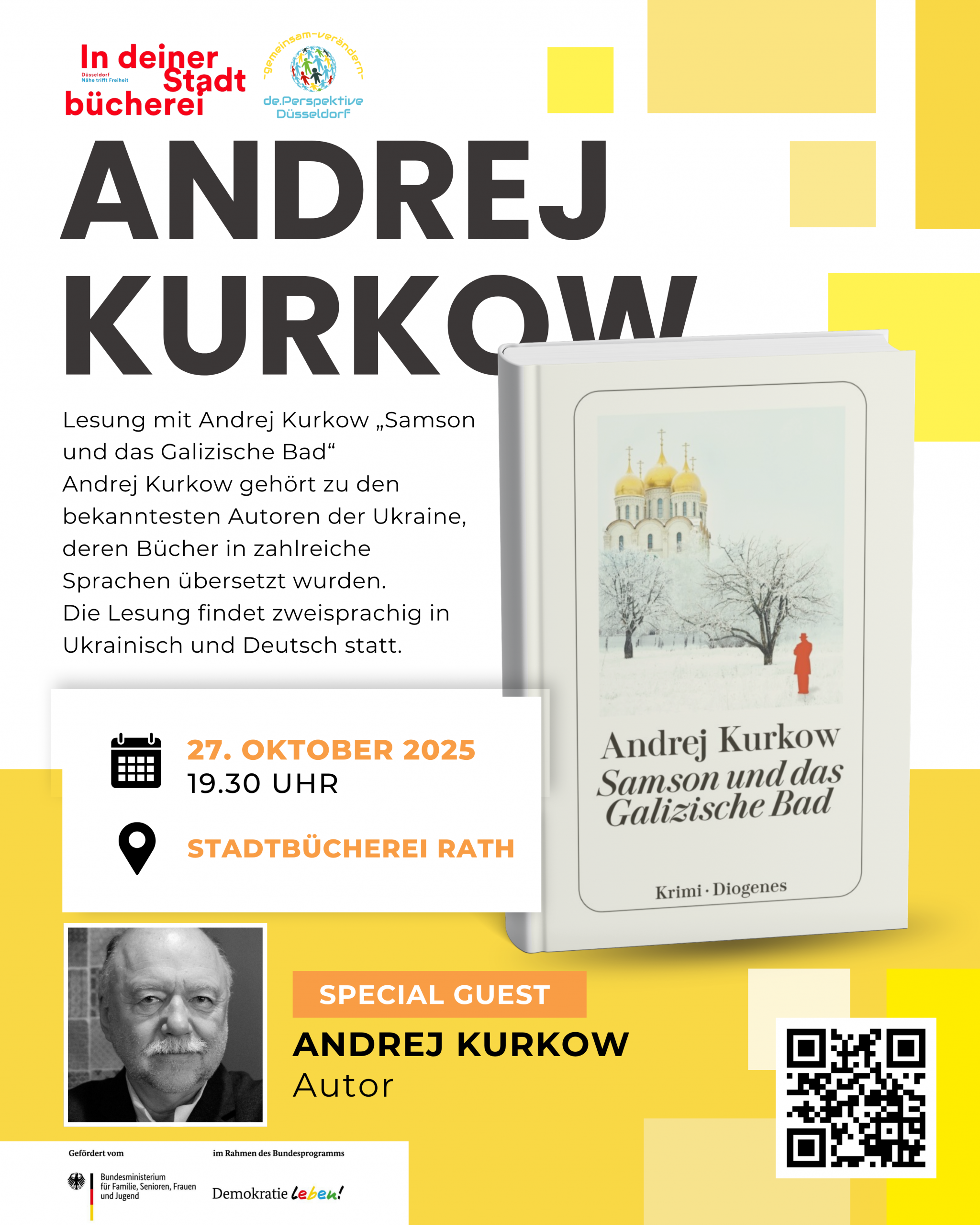 Встреча с Андреем Курковым в библиотеке Stadtbücherei Rath! Автор представит роман «Самсон и Галицкая баня» — третью часть серии «Самсон и Надежда». Двуязычное чтение на украинском и немецком языках, 27 октября 2025 года. Вход свободный, регистрация по QR-коду.