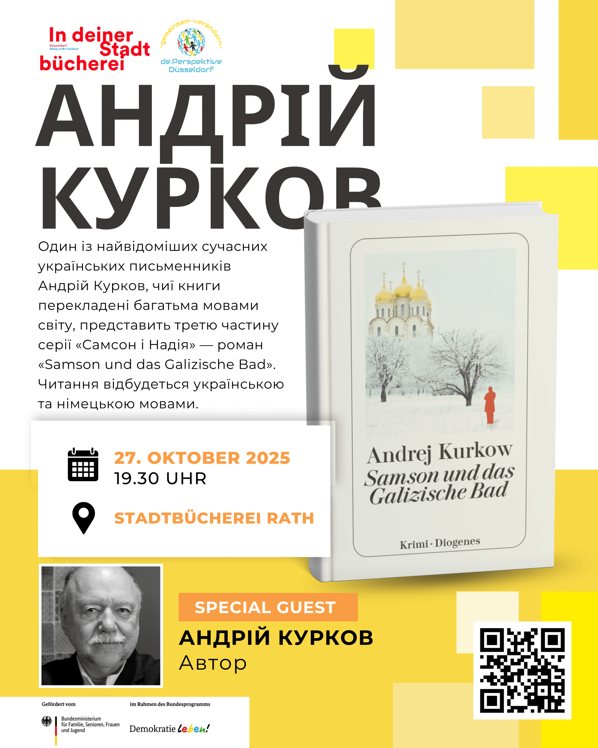 Один із найвідоміших сучасних українських письменників Андрій Курков, чиї книги перекладено багатьма мовами світу, представить третю частину серії «Самсон і Надія» — роман «Самсон і Галицька лазня».