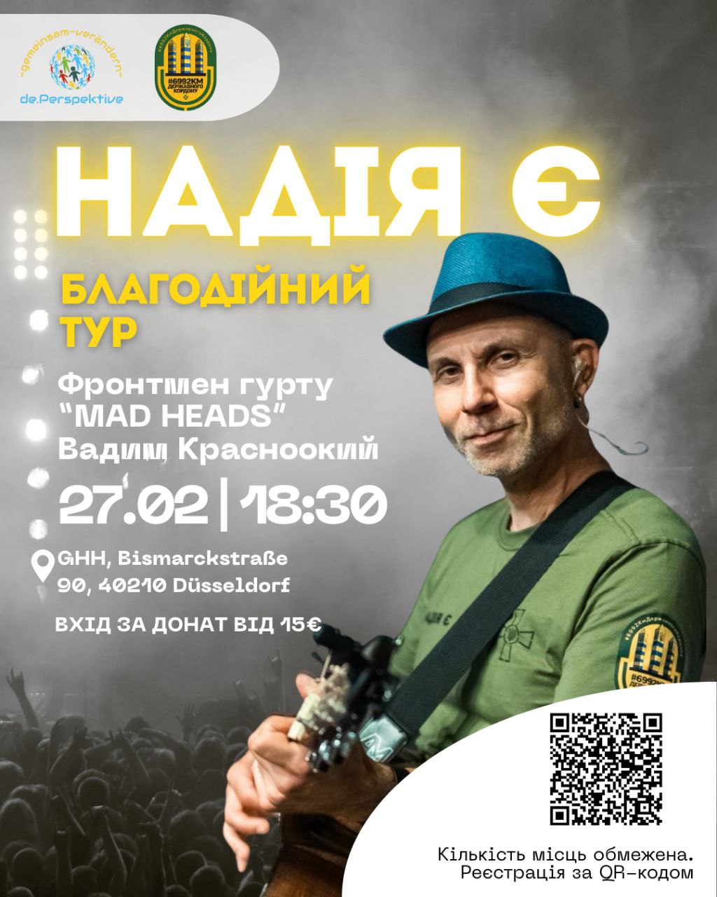 Wir laden Sie herzlich zu einem besonderen musikalischen Abend mit dem Frontmann der Band MAD HEADS, Vadym Krasnooky, ein. Das Konzertprogramm „Hoffnung gibt es“ ist ein Treffen der ukrainischen Community mit beliebten Songs, Live-Musik sowie einer warmen Atmosphäre von Zusammenhalt und Unterstützung.